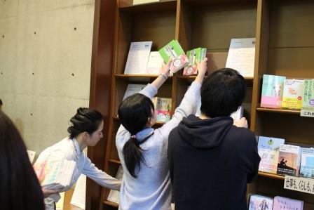 本日、MARUZEN&ジュンク堂書店梅田店において、図書館学習支援講座「書評のススメ!」に参加した17名の受講生のうち6名が、書店員の指導を受けながら陳列体験やメッセージボードの作成等を行いました。