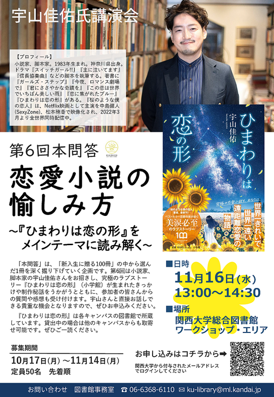 第6回となる今回は、小説家・脚本家の宇山佳佑さんを講師に迎え、「恋愛小説の愉しみ方~『ひまわりは恋の形』をメインテーマに読み解く~」と題した講演会を開催しました。