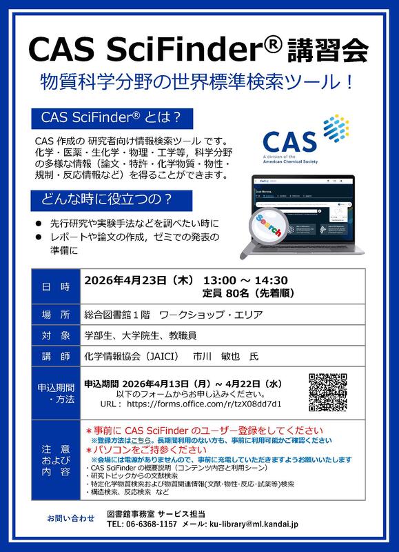 化学・生物・物理を研究される方必見、世界標準検索ツールであるCAS SciFinder講習会を行います。