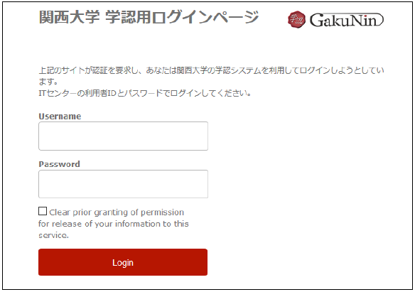 「学認」とは、国立情報学研究所が管理する機関認証システム「学認(学術認証フェデレーション)」を利用することで、これに対応したデータベースや電子ジャーナル等を関西大学統合認証システムのユーザーIDとパスワードで学外から利用することができるサービスです。詳細はこちら
