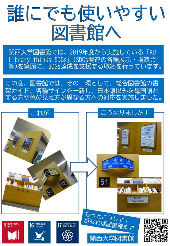 関西大学図書館では、2019年度から実施している「KU Library thinks SDGs」(SDGs関連の各種展示・講演会等)を筆頭に、SDGs達成を支援する取組を行っています。
